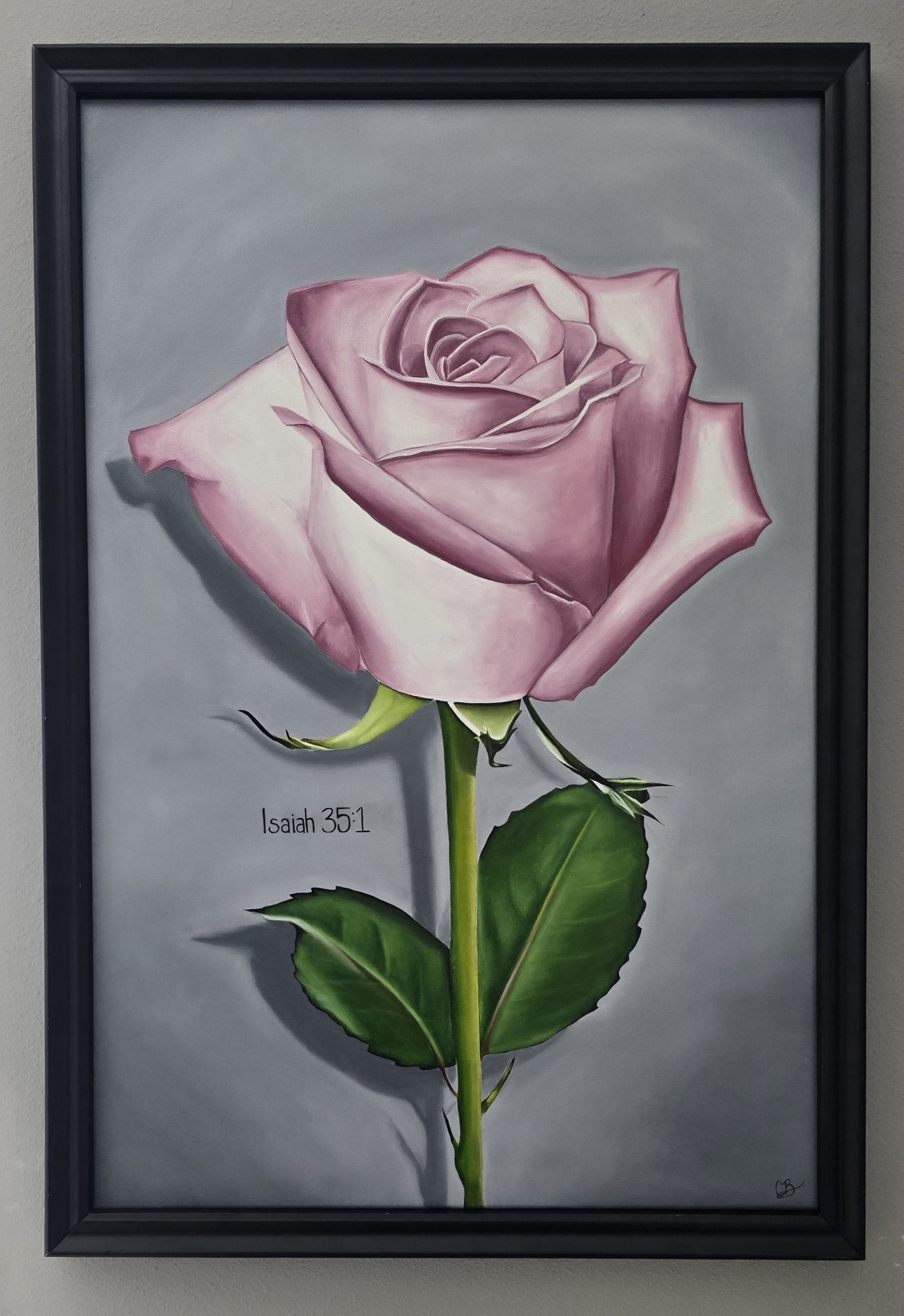 • Soft pink, touched gently with lavender, as if the rose has borrowed light from somewhere sacred. It stands alone against a quiet gray, unhurried, unafraid.