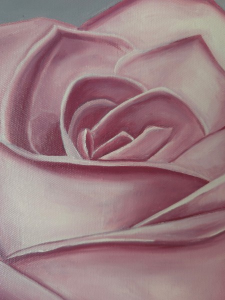 Soft pink, touched gently with lavender, as if the rose has borrowed light from somewhere sacred. It stands alone against a quiet gray, unhurried, unafraid. There is no rush here—only presence.